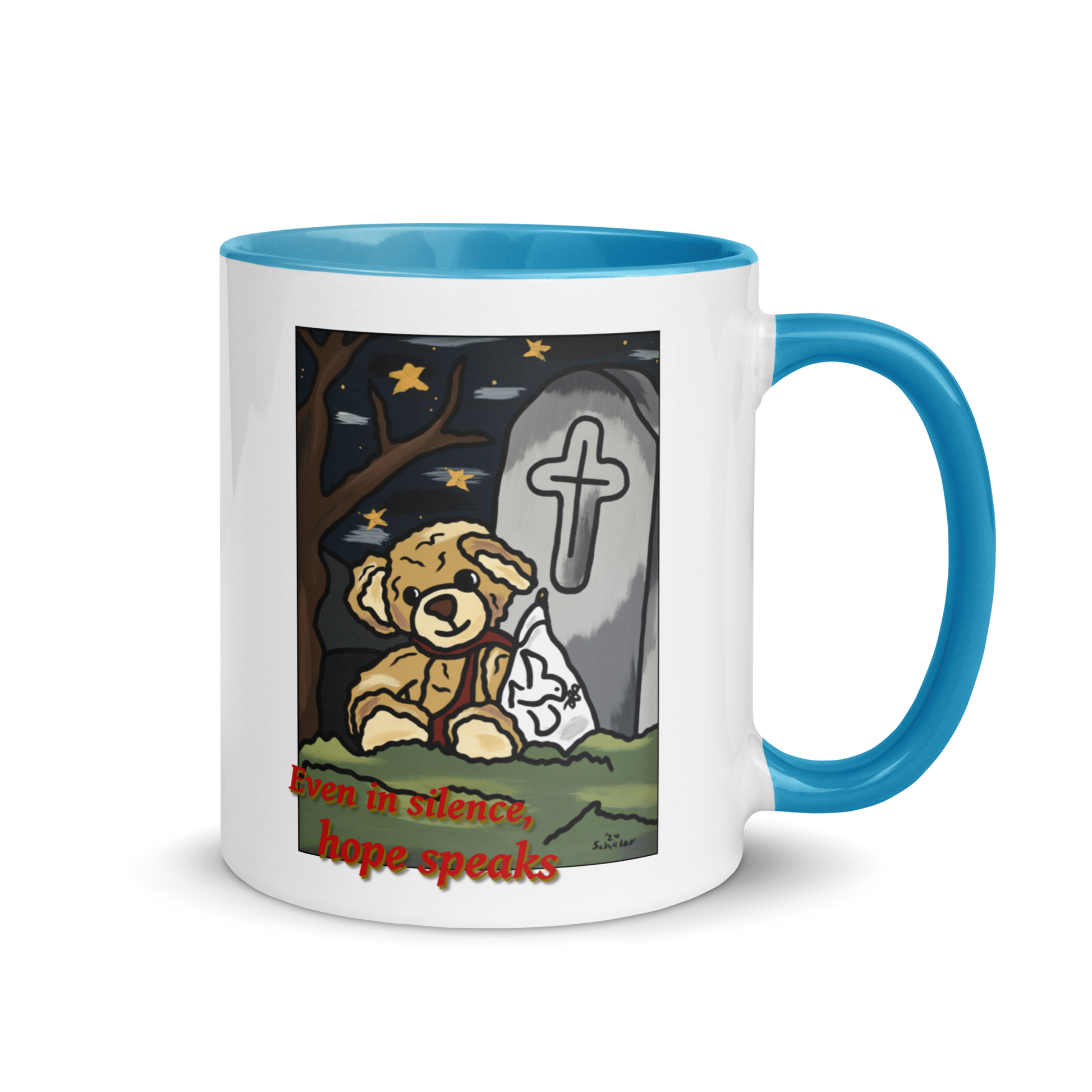 Ein stiller Wächter im Schatten des Friedens. Diese Tasse trägt die Erinnerung an das, was verloren scheint, und die leise Kraft der Hoffnung, die niemals verstummt. Der Teddybär steht vor dem Grabstein – ein Symbol für den zerbrechlichen Frieden, die Friedenstaube auf der Fahne mahnt uns: